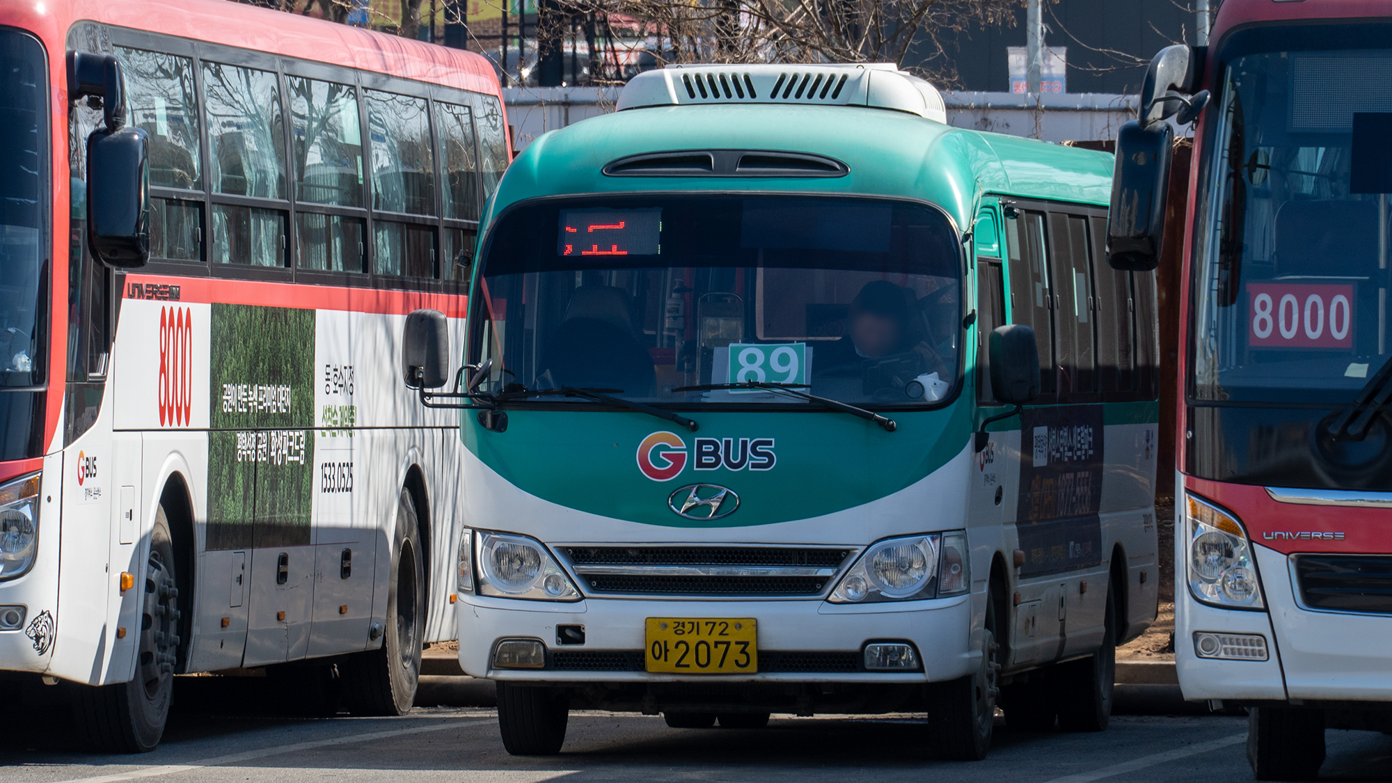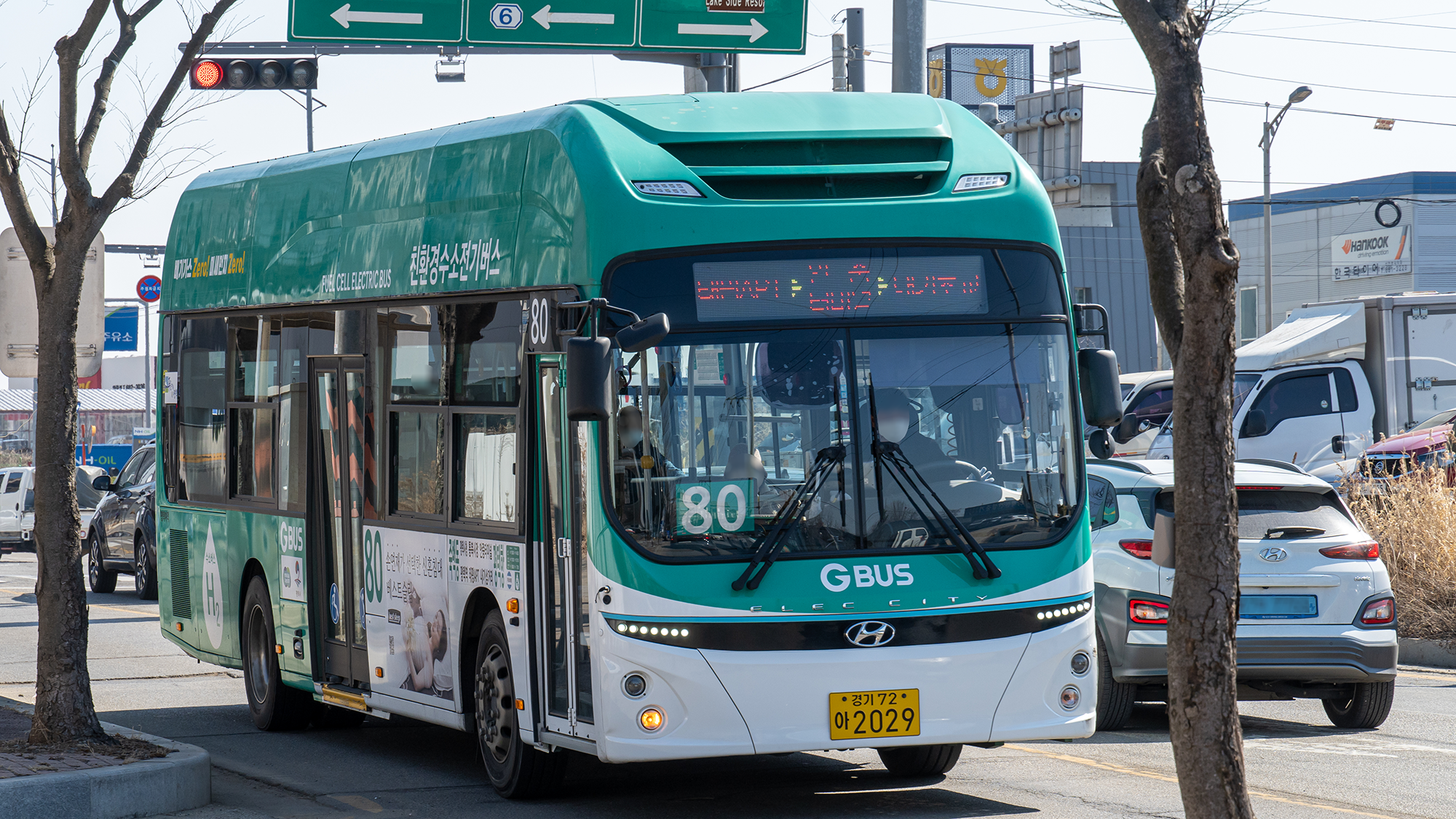 최근에 수소 일렉시티가 들어오면서 분위기가 많이 바뀐 80번입니다. 수소 일렉시티 차량은 수소 차량이기 때문에 1차 신도색이 적용되었습니다. 두 차량의 폰트, G BUS 로고 등 대비되는 모습이 보이네요.