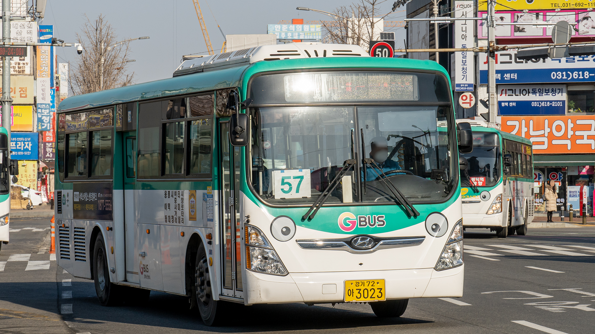 3023호는 서울고속에서 제일 빨리 출발하는 15-4번도 운행하며, 그동안 57-1번을 15번 차량이 운행하는 방식으로 차량을 운용 중이기도 합니다. 차량 경유지 스티킹은 용이동에서 시장까지만 표시되어 있는데 예비 차량으로 쓰일 수도 있어서 그런지는 모르겠습니다.